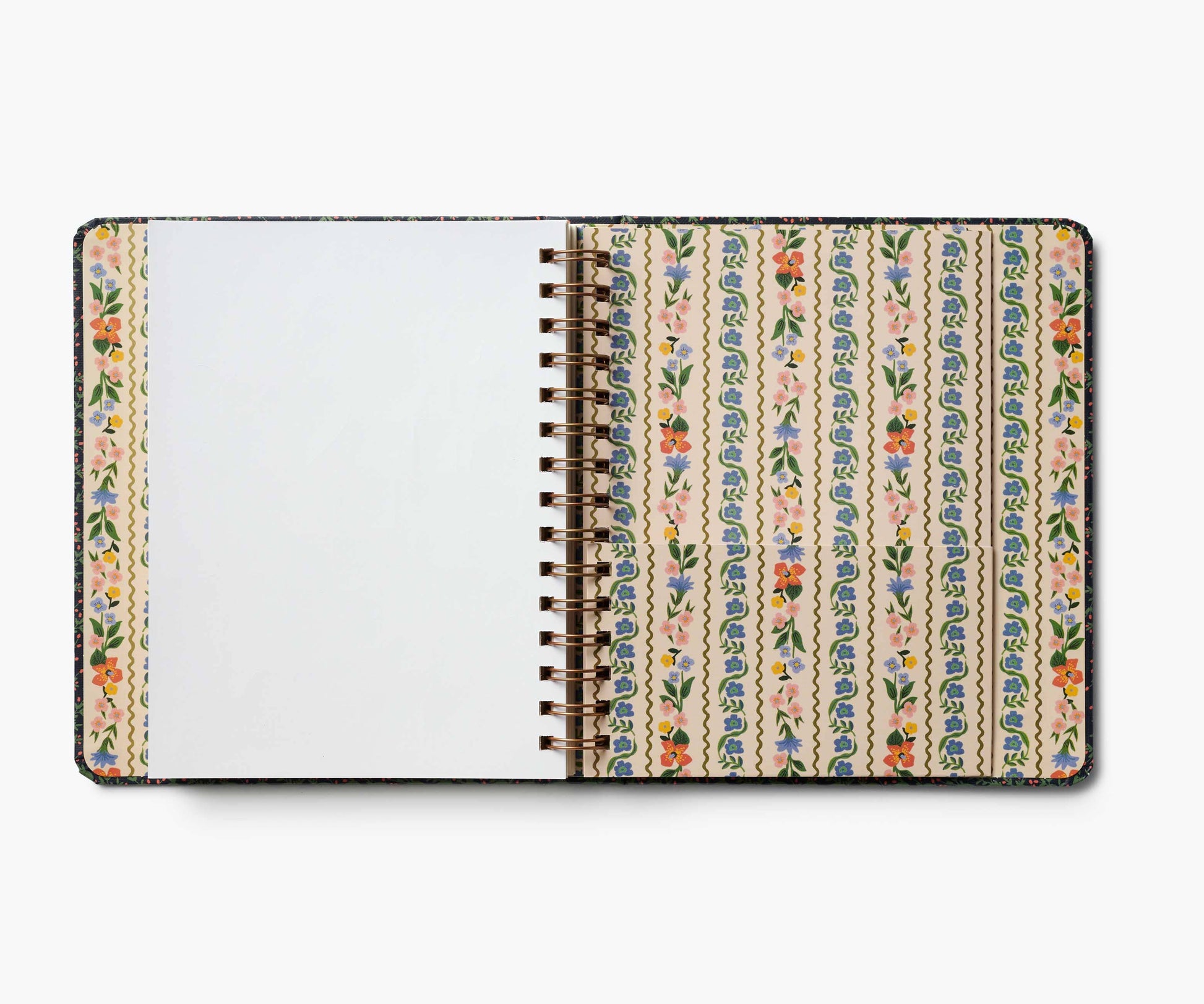 Start planning ahead with our 17-month planner. A sturdy hard cover with gold accents wraps over an interior spiral binding, and a metallic band holds the pages closed. Inside you’ll find monthly and weekly views, inspirational quotes, sections for notes and goals, an illustrated pocket folder, and 2 pages of stickers. Planners span August 2025-December 2026.