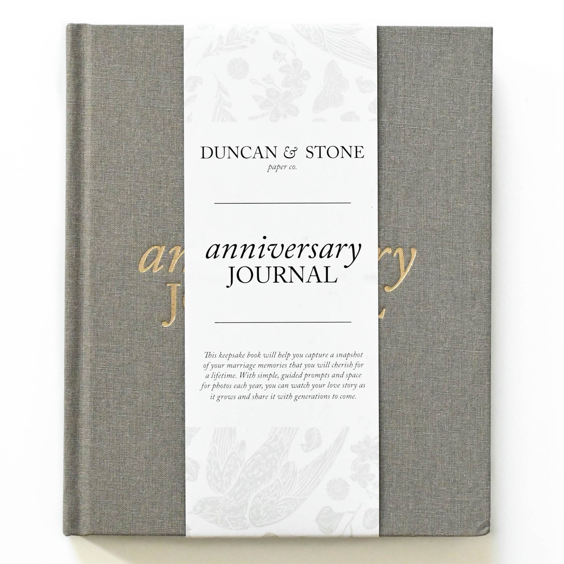 Duncan & Stone Anniversary Journal will help you capture a snapshot of your marriage memories that you will cherish for a lifetime. Starting with the details of how you met and then moving through dating and engagement, the rest of the book will store your 70th anniversary by providing you a highlight of each year. Every 10 years, there will be extra bonus pages to document the best moments from the last decade together. With simple, guided prompts and space for photos each year, you can watch your love story as it grows and relive your favorite moments through the years. PRODUCT DETAILS: - linen bound hard cover with gold embossed title and spine - 7-3/4 x 9-1/4 size - 189 pages - flat lay spine to stay open and flat for easy journaling