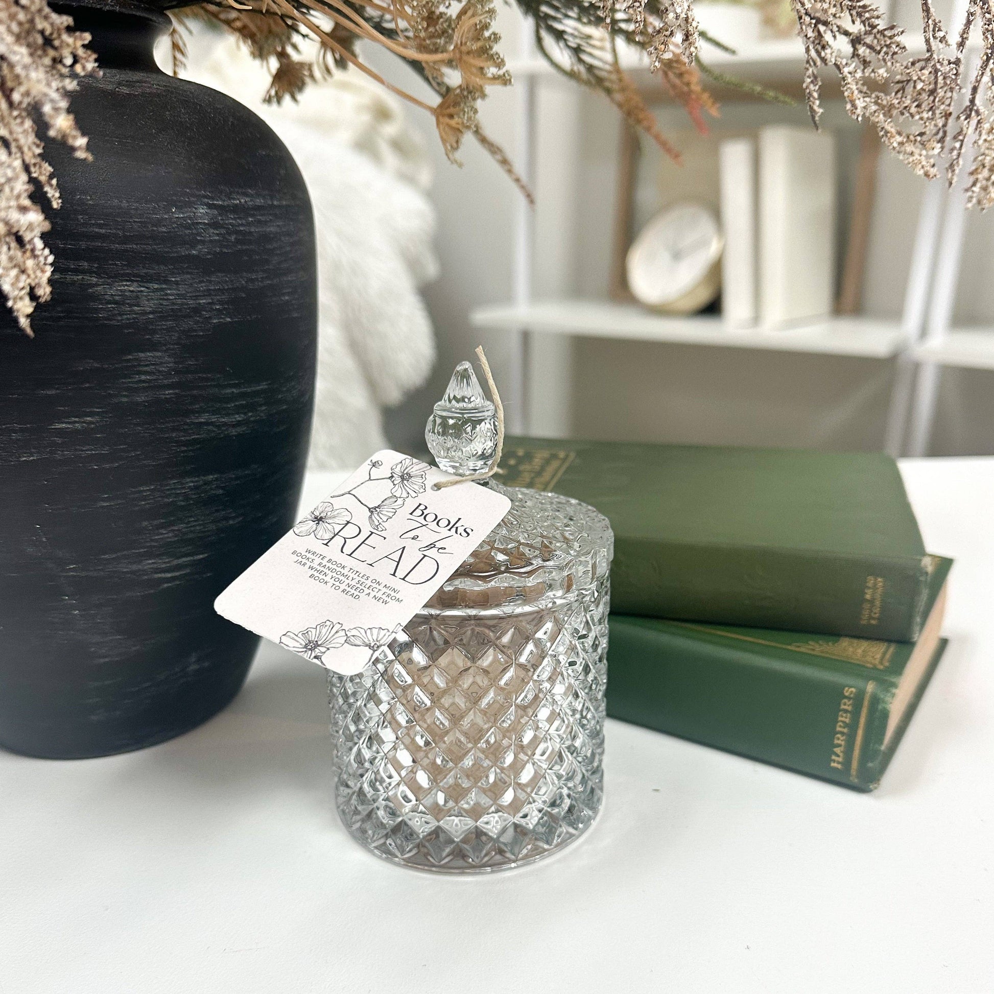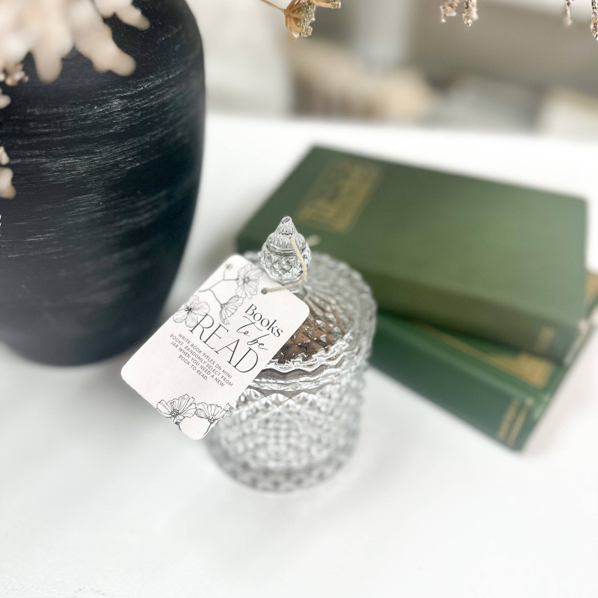 Stunning crystal glass jar with lid to organize the books you want to read. Includes folded cardstock mini books to write the title of book. When you are ready to read your next book, simply randomly pull your next read out of the jar!