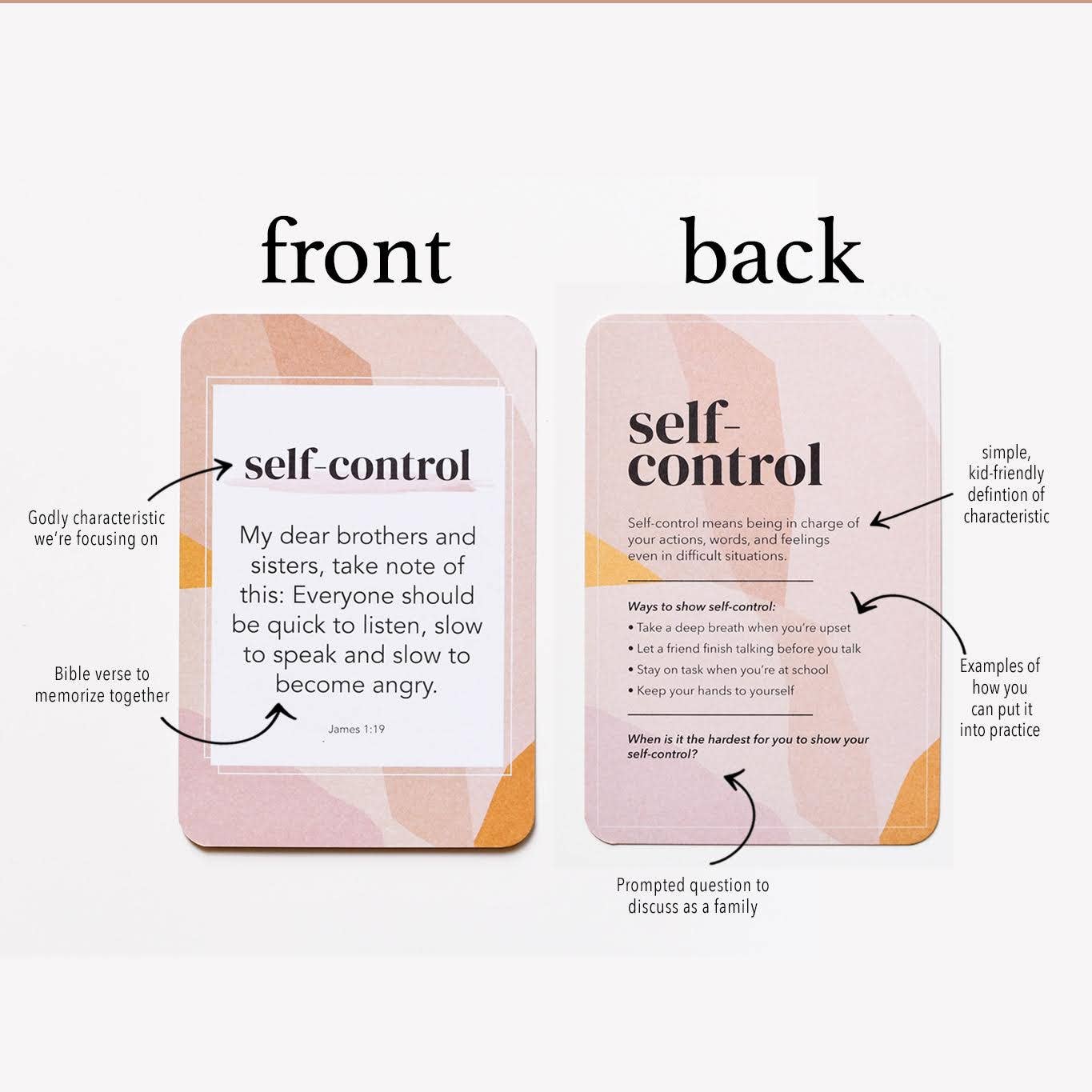 Each card shares a kid-friendly definition of a Godly characteristic, as well as a matching bible verse and ideas for how to discuss and practice the trait as a family.