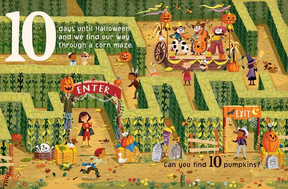 Halloween is coming! Toddlers learn to count down from 10 by finding objects hidden throughout these charming scenes of fall fun rendered in illustrator Greg Paprocki’s classically retro midcentury art style. From walking through corn mazes and bobbing for apples to choosing costumes and telling spooky stories around a fire, there’s excitement on every page. The final spread is packed with surprises! Discover new details in each illustration with every successive reading.