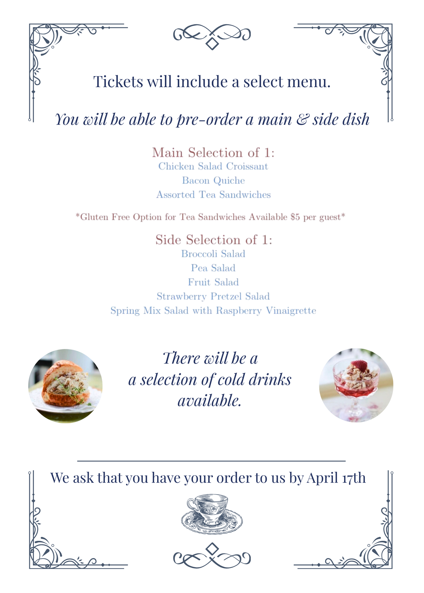 We ask that you fill out your order form as soon as possible. All orders will be sent to the tea house on April 17th.