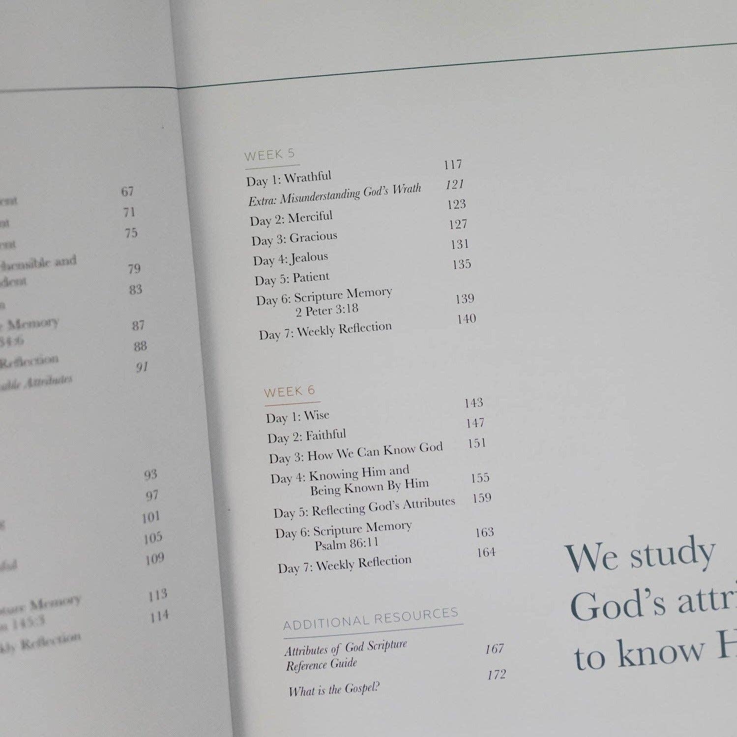 God's attributes are His characteristics. They tell us who He is and what He is like. When we know and love God, He changes everything. This 6 week study walks through God's incommunicable attributes (characteristics that are only true of Him) as well as His communicable attributes (attributes that we are called to reflect).